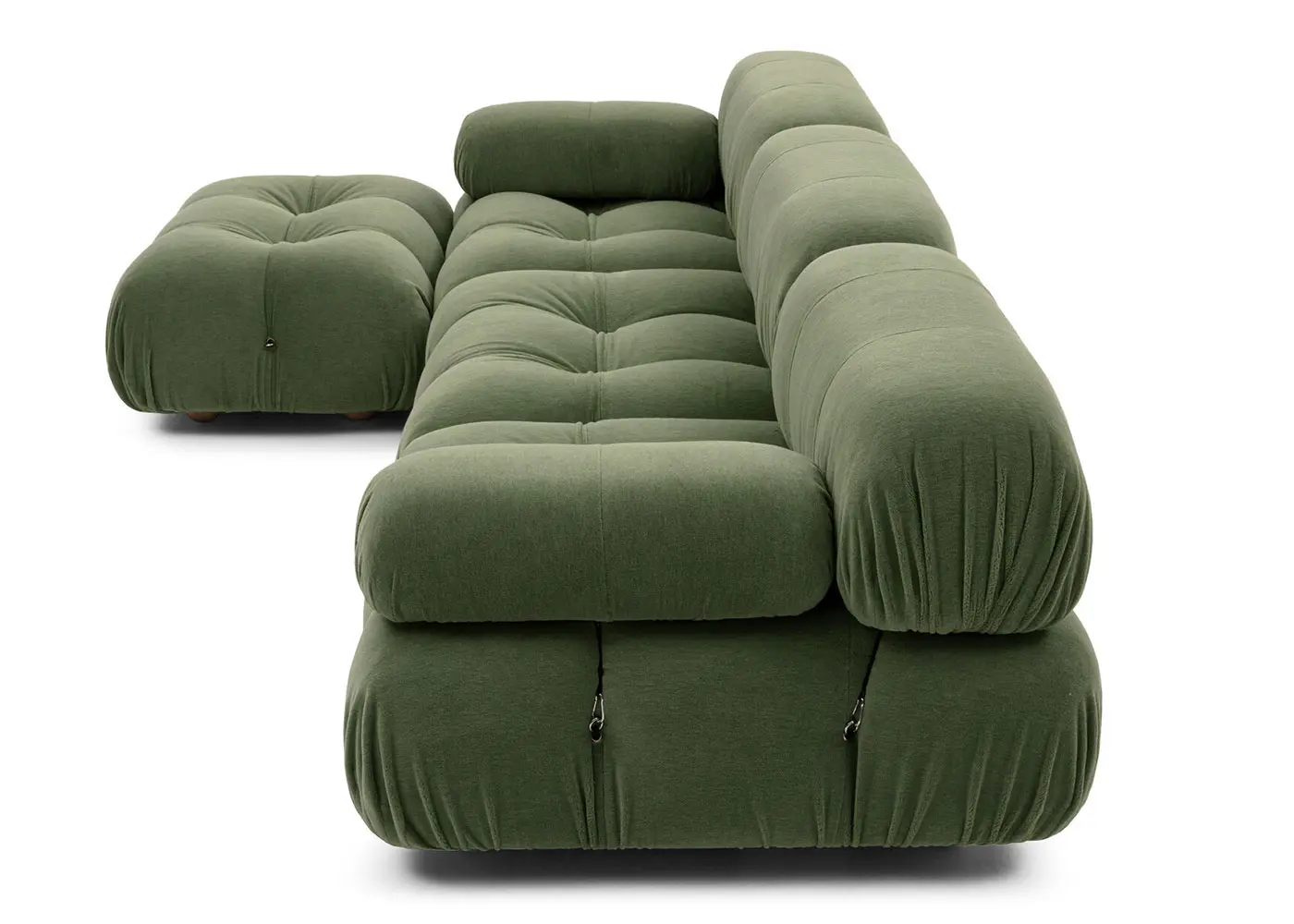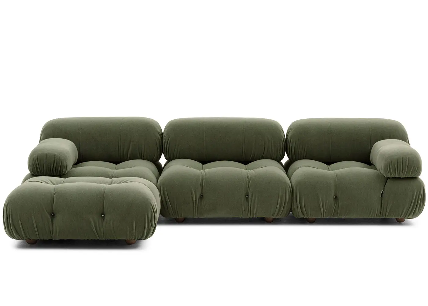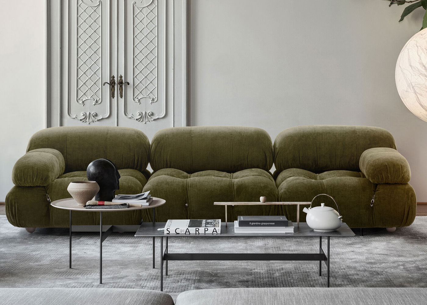 In its new version, Camaleonda preserves the elements that have made it an iconic piece of furniture. Certain elements remain faithful to the original project, such as the 90×90 cm seat module, the backrest and armrest, and the characteristic capitonné design, still manufactured with the innovative system of cables, hooks and rings created by Bellini in 1970, which defines its characteristic look and modularity. Internally, instead, it has been completely redesigned to make Camaleonda even more comfortable than the original, as well as sustainable. The internal structure is now built like a sandwich, with easily disassembled layers of recycled or recyclable materials. The core of the seats, backs and armrests is made up of wooden panels; the padding is made of polyurethane in various levels of density and firmness, with different shaped layers interacting to create a comfortable spring-like effect. This engineering feature makes Camaleonda extraordinarily comfortable and allows the interior of the sofa to be disassembled, making it easy to recycle. The fundamental characteristic of Camaleonda is its unlimited modularity, a geometric nature that allows each element to become a sort of enormous pixel through which to define your home environment. Thanks to the tie-rods and rings, the modules can be unhooked and recombined at will, allowing the sofa to adapt to an evolving taste and to the dynamic needs of those using it, while always maintaining its unique identity. Camaleonda can be upholstered with the entire textile and leather range of B&B Italia, allowing for another variable in the multitude of possible combinations. .