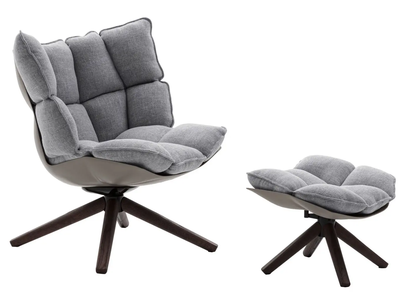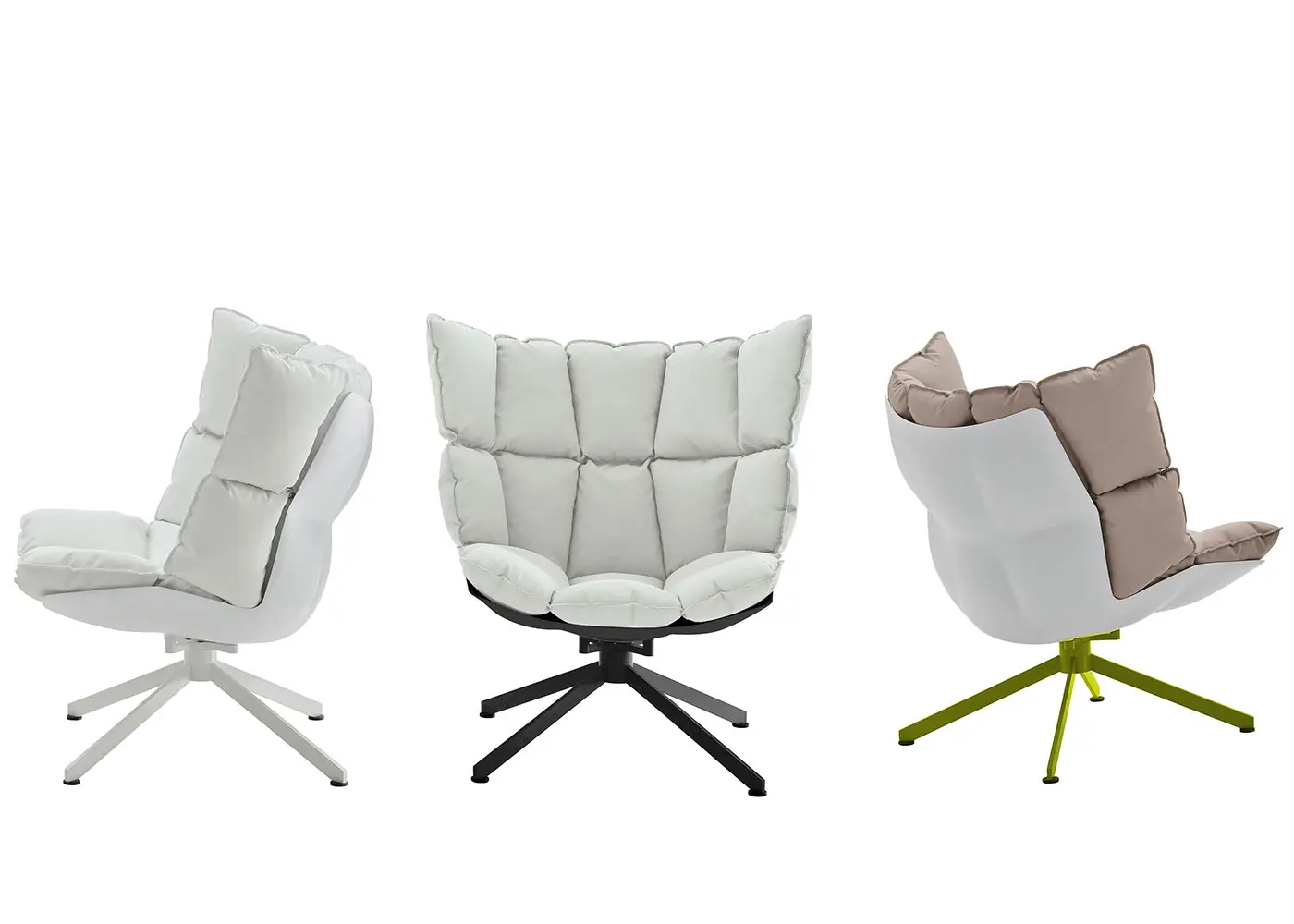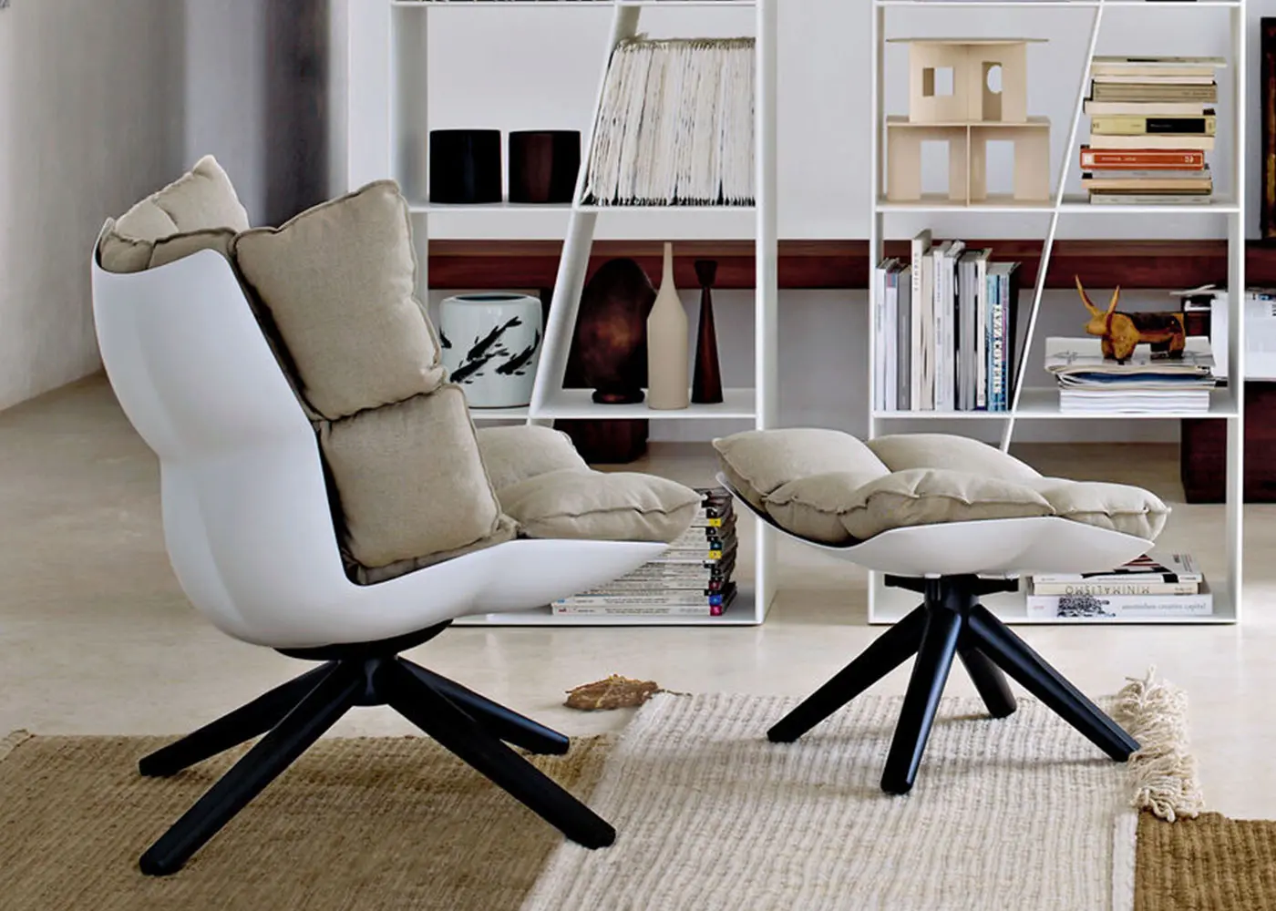 Comfort and eco-sustainability are the key words for describing the Husk high armchair. A collection that is a tribute to softness and an invitation to relax thanks to the generous extra soft cushions with a capitonné design. The hard shell is made of Hirek®, a special plastic material made up of recycled and recyclable polymers. The seat cushion stretches into a headrest. The armchair is completed by the coordinated footrest, for total relaxation.