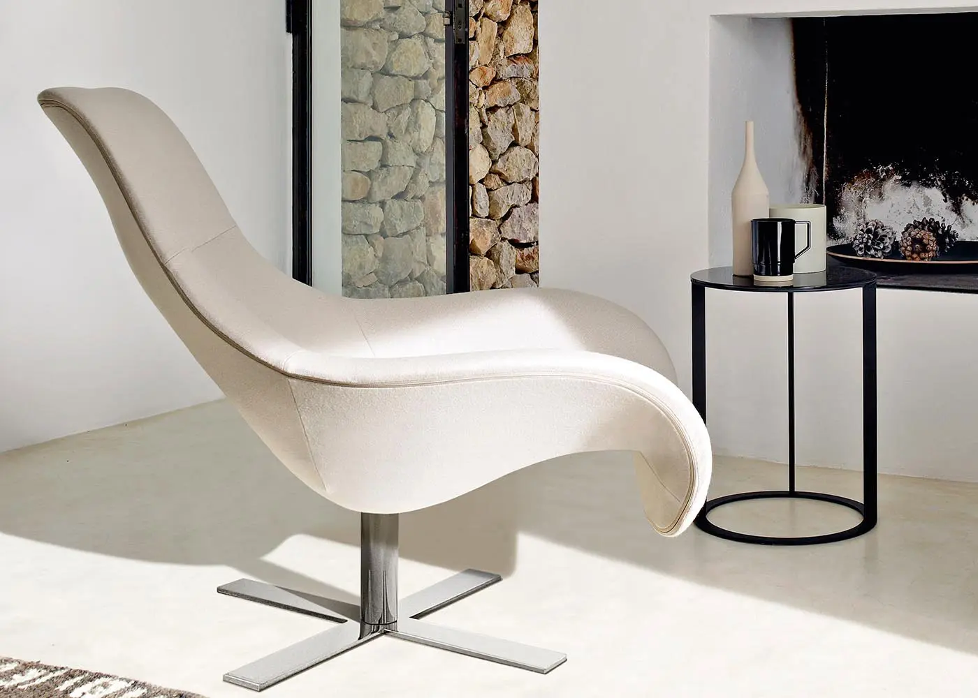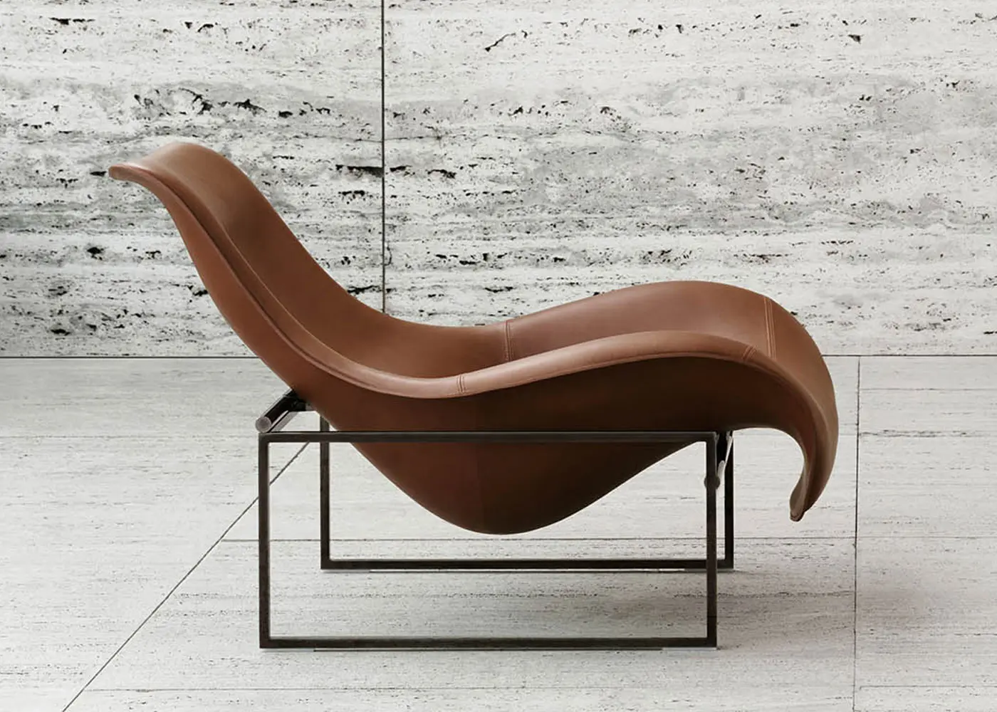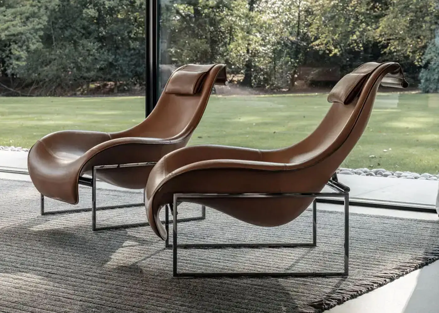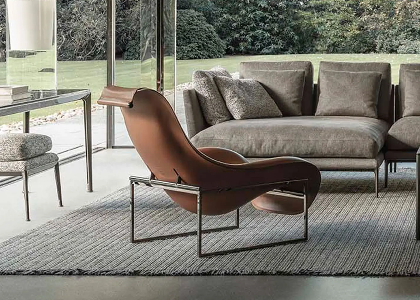 A comfortable hollow shape, in two sizes, that stands on a series of bases that create the overall character. The combination of these elements produces a family of armchairs with strong personality. At the origin of all of them, a long experimentation centred on the production technology of thermoformed leather, starting from a plastic shell that is inserted into a mould for the cold foaming of polyurethane, with the result of obtaining elasticity and comfort.