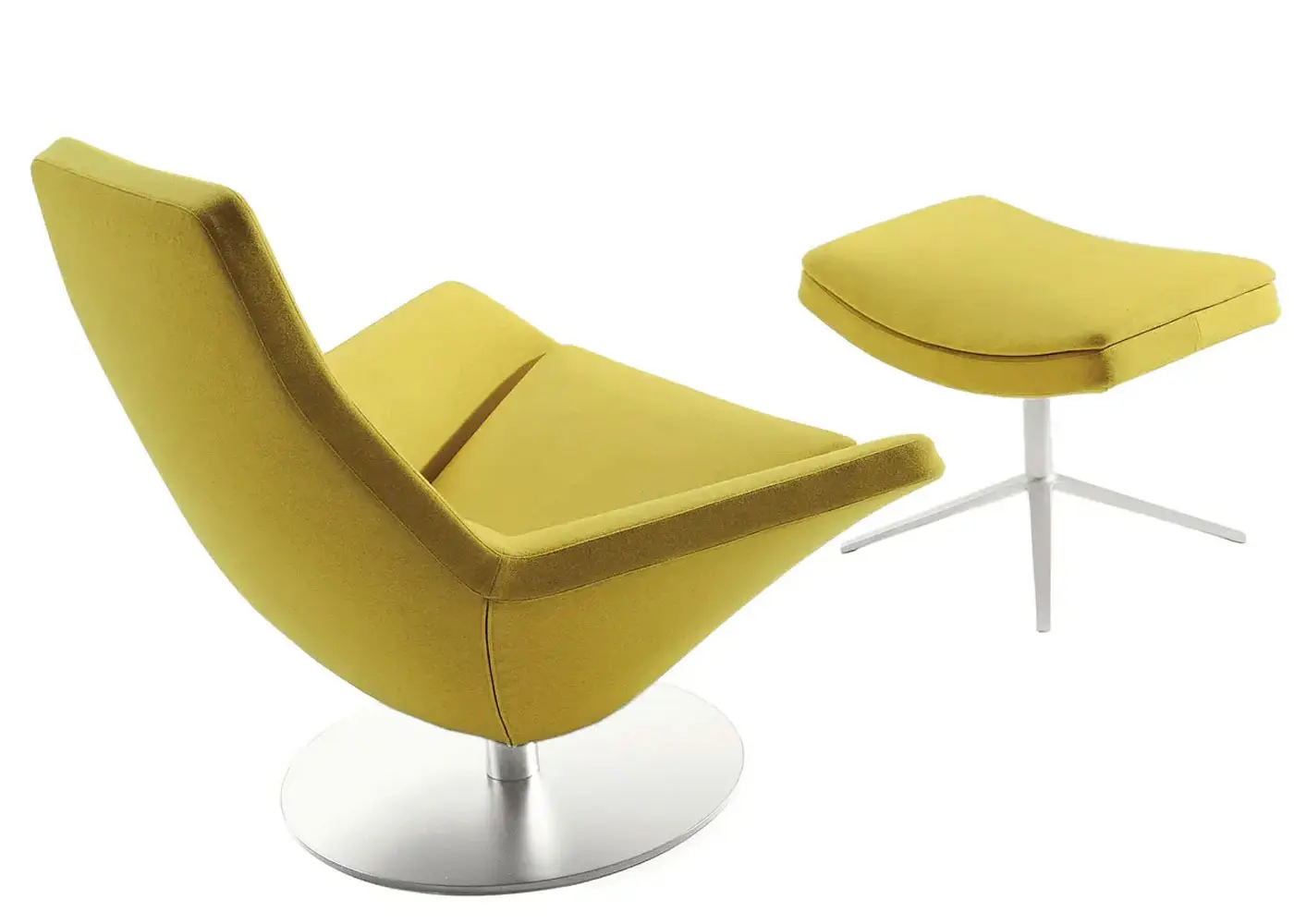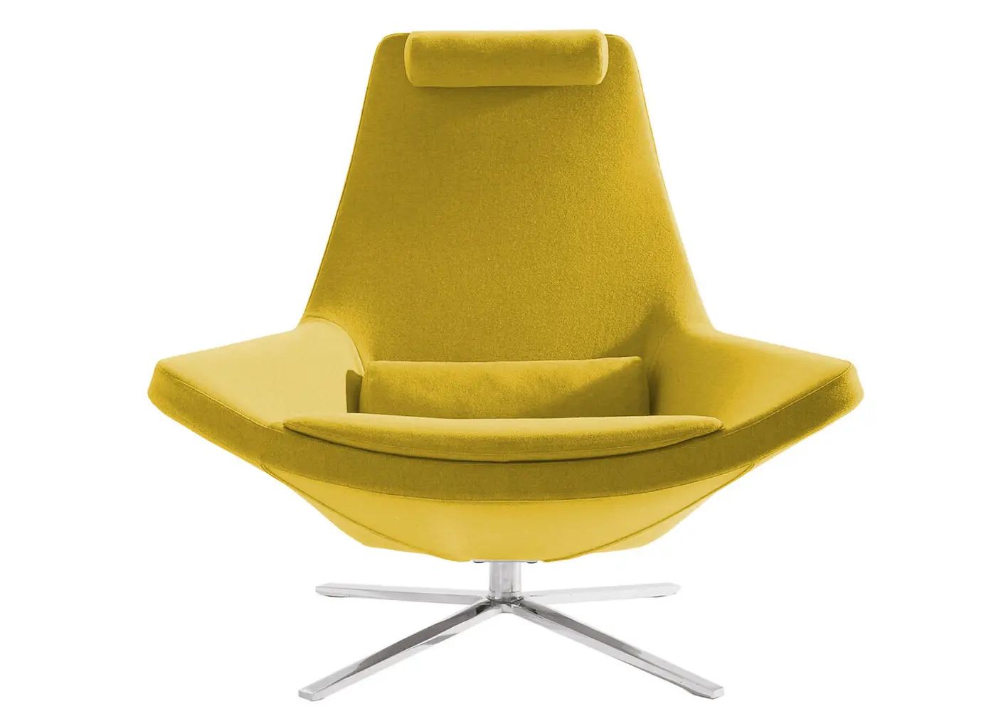 The seat that flows uninterruptedly into the armrests is the hallmark of this armchair. With a swivel base in aluminium with four spokes, it combines elegance and comfort. Supplied with headrest with magnets for adjustments.
