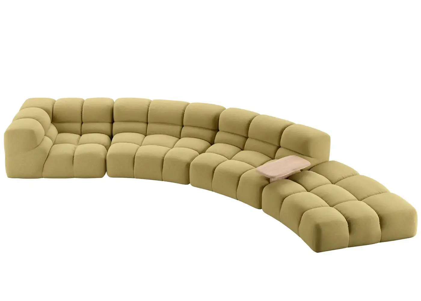 Tufty-Time 20 represents the contemporary evolution of Tufty-Time, the iconic sofa system designed by Patricia Urquiola in 2005. Twenty years after its launch, the system has been reinterpreted while maintaining the essential characteristics that have made it a great success, including modularity, enveloping comfort and compositional flexibility. The volumes, padding and seat height have been redesigned to offer even greater comfort, while the introduction of a curved module expands the system’s potential, giving rise to even more fluid and convivial configurations, ideal for both residential and contract spaces. Particular attention has been paid to the theme of circularity. Tufty-Time 20 is in fact fully disassemblable, ensuring that all the components can be given a second life at the end of the product’s life cycle.