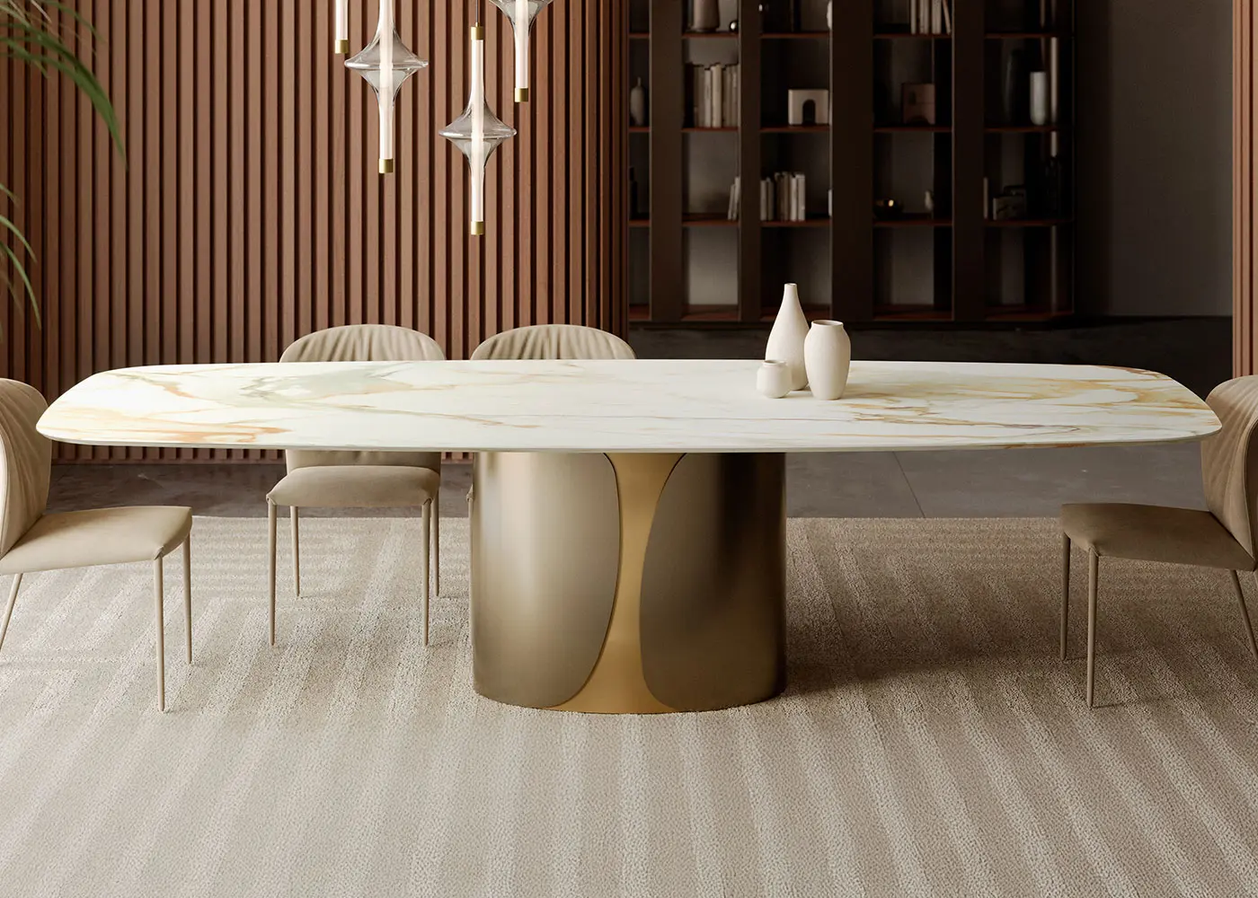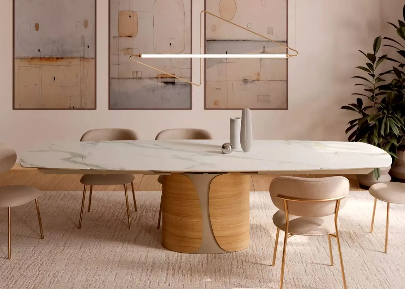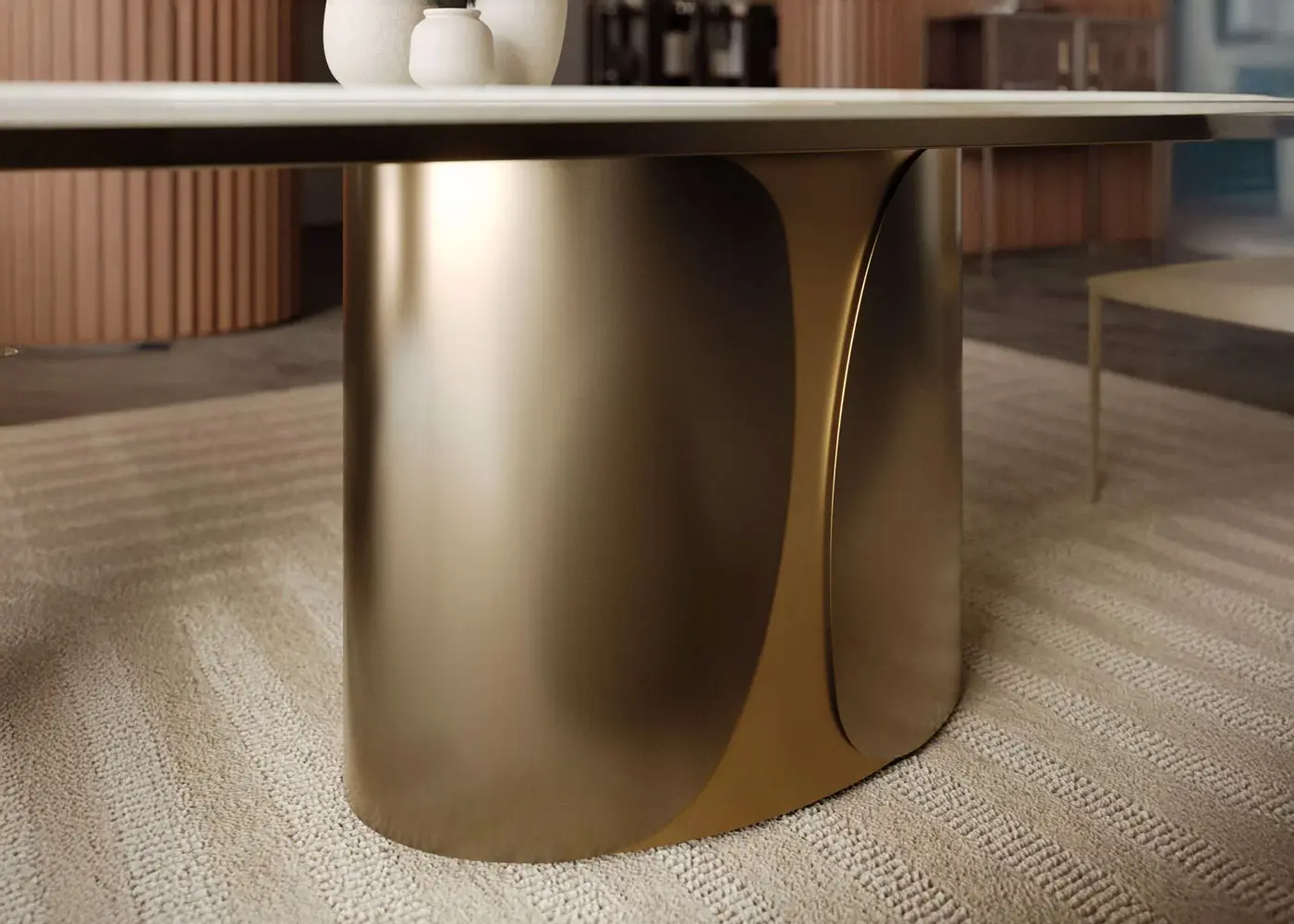 Talos is a table that commands space with solid elegance and architectural presence. Its defining feature is the monolithic elliptical base, composed of two symmetrical shells that embrace the central body. In the metal version, the base stands out for its refined colour combinations, creating either visual vibrations or sophisticated tone-on-tone effects. In the alternation between metal and wood, on the other hand, the warmth of natural materials merges with the sheen of metallic finishes, achieving a harmonious balance between texture and precision. In every version, Talos retains its theatrical identity and commanding presence, shaping the space with charisma