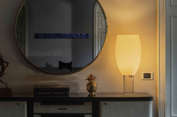 Sophisticated wealth and prized materials. the star of the Buds 1 table lamp is the blown glass diffuser with its elongated shape, with craft-based five-layer processing, combined with a transparent base which enhances the elegance of its design.