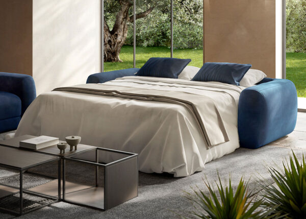 A handle positioned on the backrest allows for easy opening, transforming the sofa into a sofa bed in a single gesture.
