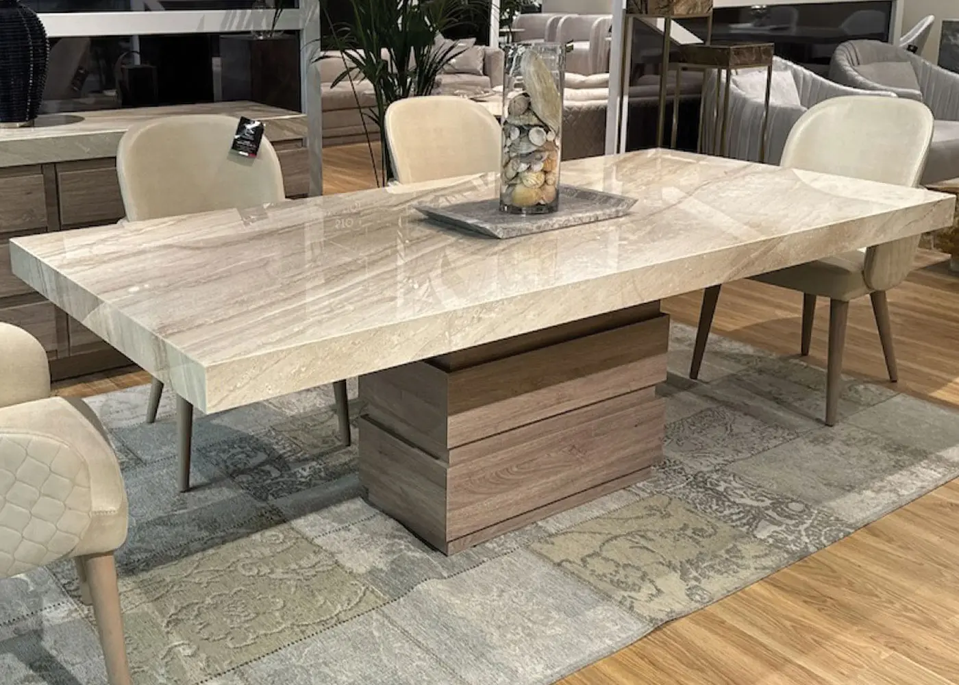 Rectangular or square shaped tables with wooden base available in different finishes and natural marble top with thick smooth edge.